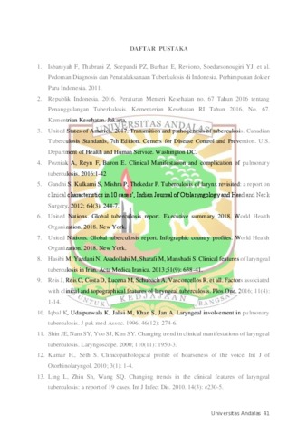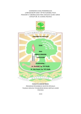 Erindra, Adrian (2020) GAMBARAN HASIL PEMERIKSAAN LARINGOSKOPI SERAT OPTIK FLEKSIBEL PADA PENDERITA TUBERKULOSIS PARU DENGAN SUARA SERAK DI RSUP DR. M. DJAMIL PADANG. S2 thesis, Universitas Andalas.